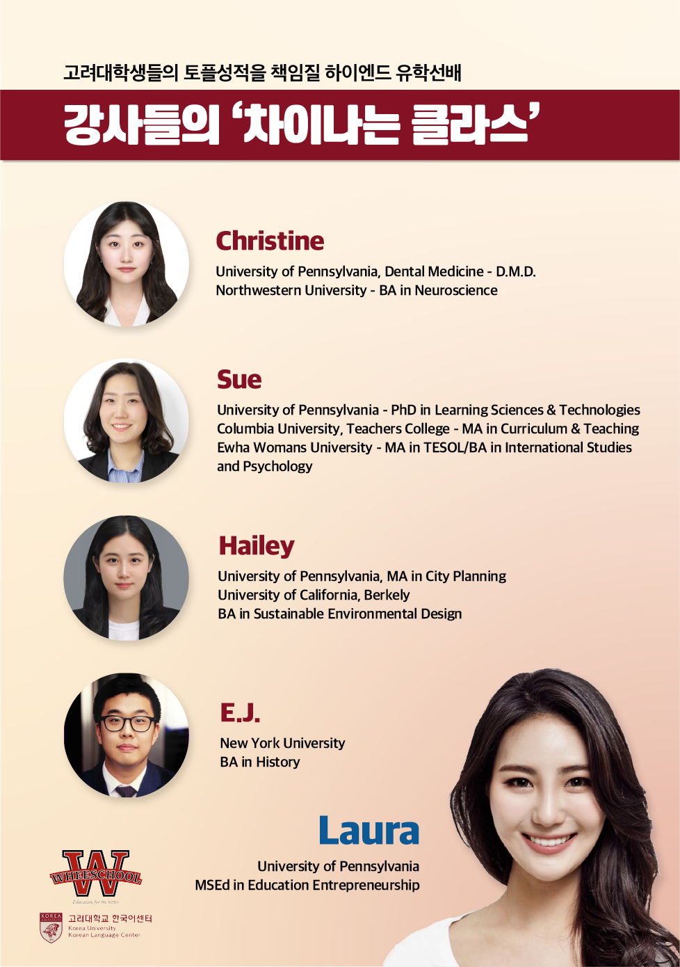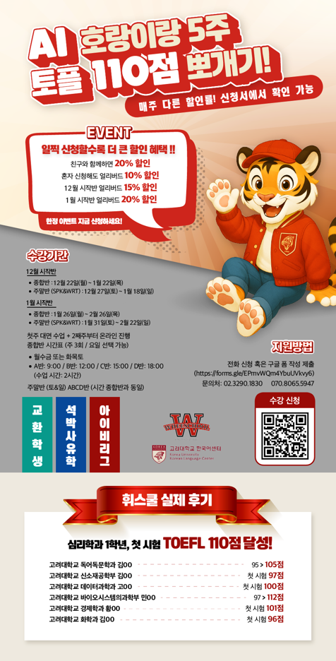 고려대학교 외국어센터에서는 본교 학생들의 목표 토플 점수 달성을 돕기 위해 ‘AI 호랑이, 빠르게 토플 110점 방학 동안 어흥’ 프로그램을 아래와 같이 운영합니다. 이미 본교에서 성과를 거둔 본 과정에서는 AI 기술을 활용한 정확한 실력 진단과 학습 로드맵 설정으로 더 효과적이고 정확한 토플 학습이 가능합니다. 얼리버드 할인 이벤트가 진행 중이니 많은 신청 바랍니다.