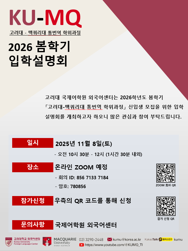 국제어학원 외국어센터는 2026학년도 봄학기 고려대-맥쿼리대 통번역 학위과정」 신입생 모집을 위한 입학설명회를 개최하고자 하오니 많은 관심과 참여 부탁드립니다