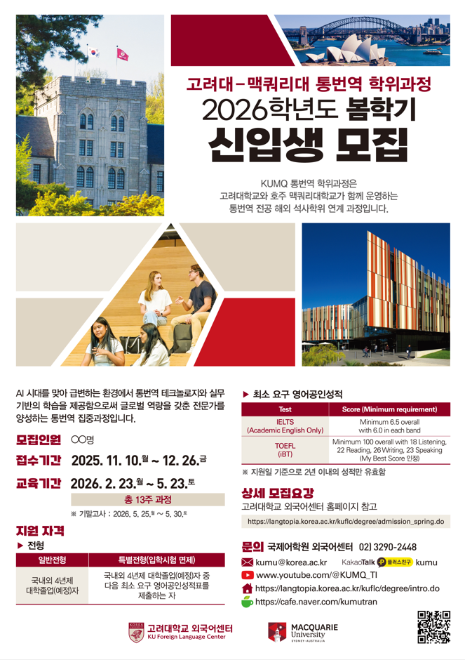 고려대-맥쿼리대 통번역 학위과정 2026학년도 봄학기 신입생 모집