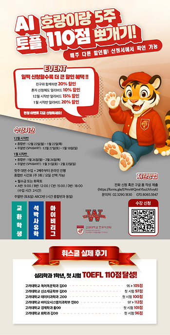 1. 수업 기간: 2026년 1월 5일(월)~1월 23일(금) *1월 5일(월) 첫째 날은 OT 예정 2. 수업 시간: 오전 9시 ~ 오후 2시 3. OT 장소: 국제관 321호 원형강의실 4. 준비물: 필기구, (교재구매용) 현금 5. 수업교재: 자체 제작 교재 (OT 후 국제관 208A 호에서 구매) 6. 교재비: 15,000원 (현금만 가능) 문의: kuifls@korea.ac.kr