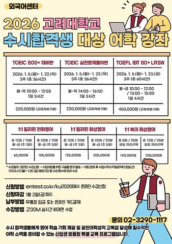 2026학년도 수시 합격생 대상 어학강좌 안내 ※ 접수 방법: https://entest.co.kr/ku2026 본 프로그램은 대학 입학부터 졸업 전까지 이어지는 취업 준비 과정에서 필수적인 요소인 어학 능력을 사전에 갖출 수 있도록, 공인영어시험 대비를 중심으로 구성된 교육 과정입니다. 수도권 외 지역에 거주하는 합격생을 포함하여 모든 입학 예정자가 참여할 수 있도록, 모든 강좌는 실시간 온라인 수업으로 운영됩니다. * 프로그램 구성 1) 수시 합격생을 위한 TOEIC 과정 (실시간 온라인) 2) 수시 합격생을 위한 TOEFL 과정 (실시간 온라인) 3) 수시 합격생을 위한 원어민 화상영어 프로그램 4) 수시 합격생을 위한 원어민 전화영어 프로그램 ※ 문의처 TOEIC, TOEFL, 화상·전화영어 프로그램 ☎ 02-3290-1117