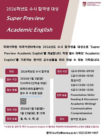 2026학년도 수시합격생 대상 「Super Preview Academic English」 개강 안내