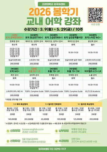 - (어학강좌) 2026년 봄학기 교내 어학강좌 모집 안내 2026년 외국어센터 봄학기 교내 어학강좌 안내 국제어학원 외국어센터에서는 공인어학성적 고득점 달성을 목표로 학습하는 학생들을 위하여 단기 집중 어학 강좌 수강생을 모집하고 있습니다. 대면 또는 줌(Zoom) 프로그램을 활용한 실시간 라이브 수업으로 진행되니 관심 있는 학생들의 많은 참여 바랍니다. ■ 프로그램 세부사항 1. 진행 프로그램 : 토익, 토익스피킹, 오픽, 토플, 아이엘츠 ※ 진행 프로그램 첨부(홍보물) 파일 별첨 2. 수업 진행방식 : 대면 or 비대면 3. 접수기간 : 2026. 02. 27.(금) ~ 2026. 03. 13.(금)까지 - 과목별 신청 인원에 따라 조기 마감될 수 있음 4. 진행기간 : 2026. 03. 09.(월) ~ 2026. 05. 29.(금) / 10주 - 중간고사 휴강기간 : 2026. 04. 13.(월) ~ 2026. 04. 24.(금) / 2주 - 공휴일 휴강 : 05.01.(금) 근로자의 날 / 05.05.(화) 어린이날 / 05.25.(월) 대체 공휴일 5. 수강생 혜택 1) 모의영어시험 제공 - 토익, 토익스피킹, 오픽 신청자 2회 제공 - 토플, 아이엘츠 과목 신청자 1회 제공 2) 수업 녹화강의 지원 - 비대면 강좌에 한 함 - 실시간 수업 녹화 강의 지원으로 복습 가능 - 2026년 6월까지 제공 6. 수강신청 - 온라인 신청: https://korea.english.co.kr 접속 >> 회원가입 >> 수강신청 >> 과정선택 >> 수강료결제 >> 등록 완료 7. 수강료 납부 안내 1) 무통장 입금 : 우리은행 1005-602-195585 (예금주 : 외국어센터) ※ 입금 시 학생 본인 이름으로 입금 2) 카드 결제 : korea.english.co.kr >> 회원가입 >> 수강신청 >> 신청 후 카드 결제 ■ 프로그램 자세히 보기 : https://info.english.co.kr/brochure/1471 ■ 수강신청 바로가기 : korea.english.co.kr ■ 문의 : 02) 3290-1117 고려대학교 국제어학원 외국어센터 2026.02.27